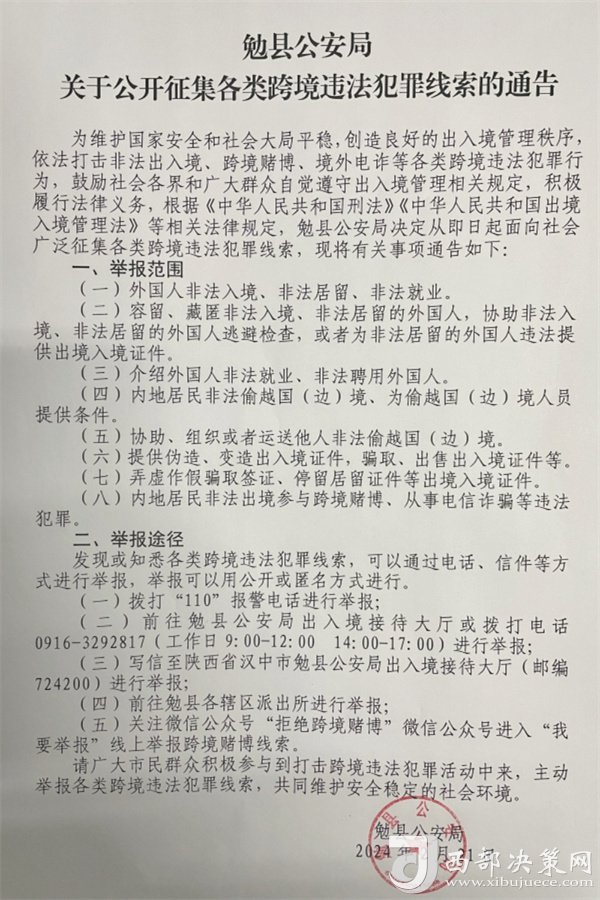西部決策網(wǎng)訊 為維護國家安全和社會大局平穩(wěn),創(chuàng)造良好的出入境管理秩序,依法打擊非法出入境、跨境賭博、境外電詐等各類跨境違法犯罪行為,鼓勵社會各界和廣大群眾自覺遵守出入境管理相關(guān)規(guī)定,積極履行法律義務(wù),根據(jù)《中華人民共和國刑法》《中華人民共和國出境入境管理法》等相關(guān)法律規(guī)定,勉縣公安局決定從即日起面向社會廣泛征集各類跨境違法犯罪線索,現(xiàn)將有關(guān)事項通告如下: