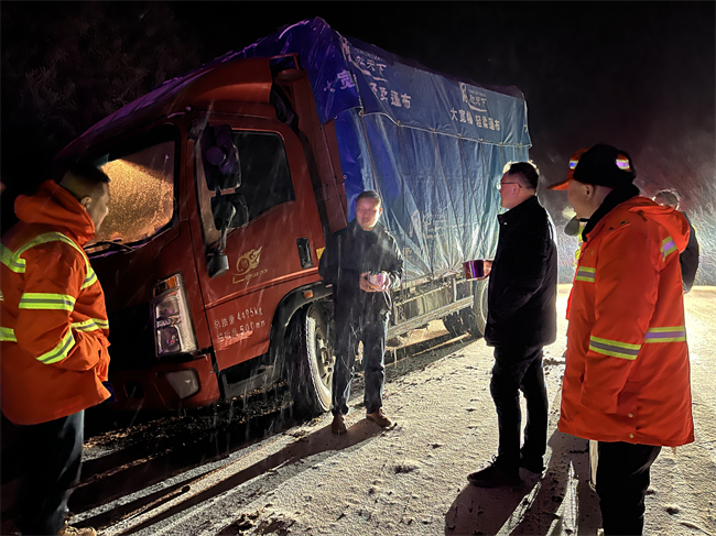 除雪保暢小分隊(duì)為過往受困車輛司機(jī)提供食物、熱水服務(wù)