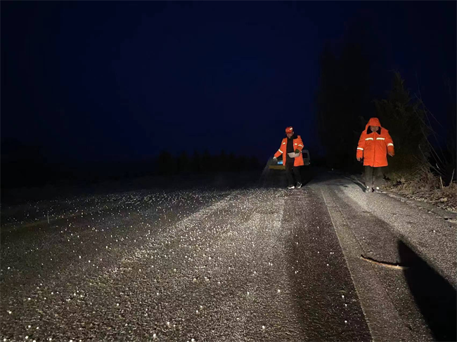 除雪保暢小分隊(duì)在G344堯典段人工撒融雪劑除冰