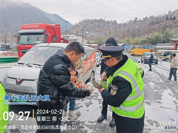 西略分公司所轄各站組織人員為司乘提供饅頭、雞蛋、豆奶、方便面、熱水等簡(jiǎn)餐,并對(duì)滯留車輛做好解釋工作,安撫司乘焦躁情緒,讓司乘在寒潮天氣里感受到陜西交控人的溫暖與關(guān)心。(西略分公司)