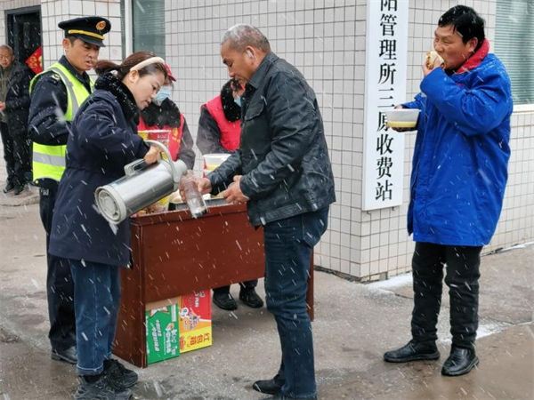 西富分公司轄區(qū)各收費(fèi)站志愿服務(wù)小分隊(duì)為滯留司乘提供熱水、飯菜等,并與司乘親切交談,耐心解答道路實(shí)時(shí)情況。(朱顏)