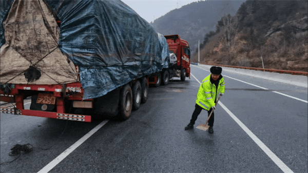 銀昆高速寶雞至鳳縣段路面結(jié)冰易滑,貨車突然失去動(dòng)力無法行駛,寶雞分公司寶坪管理所組織人員力量在路面揮锨撒沙、疏導(dǎo)交通。(鄧巖)
