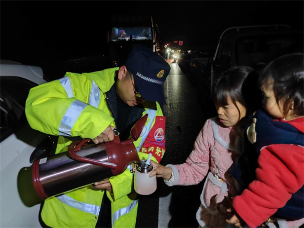 省路政執(zhí)法總隊(duì)第十支隊(duì)五大隊(duì)在營(yíng)盤收費(fèi)站外開展志愿者送溫暖行動(dòng),執(zhí)法人員為滯留旅客提供熱水,雞蛋,香腸,饅頭等食物,在嚴(yán)寒惡劣天氣為廣大群眾送上貼心溫暖。(王合歡)