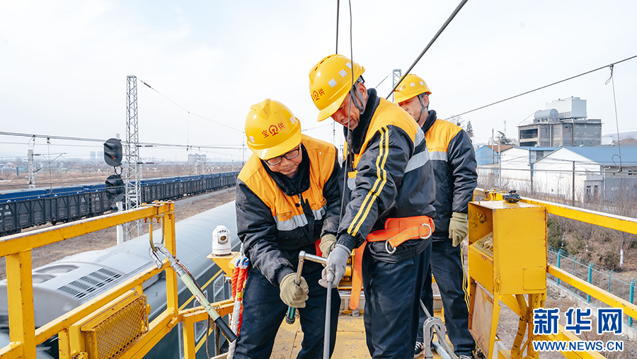 在隴海鐵路虢鎮(zhèn)至陽平區(qū)段,劉建強(左)和工友們在供電接觸網軌道作業(yè)車上緊固供電設備接觸網腕臂支撐。劉一江 攝