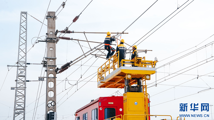 春運期間,在隴海鐵路虢鎮(zhèn)至陽平區(qū)段,劉建強和他的工友們在供電接觸網軌道作業(yè)車上進行檢修作業(yè)。劉一江 航拍