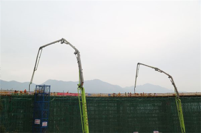 長慶互通B匝道橋上部結(jié)構(gòu)為鋼筋混凝土連續(xù)箱梁,長約100米,混凝土體積705立方米,采用盤扣式滿堂支架現(xiàn)澆法施工。為保障混凝土澆筑安全和質(zhì)量,項(xiàng)目部主要管理人員現(xiàn)場帶班,旁站監(jiān)理工程師現(xiàn)場履職,并配置46米混凝土泵車2臺,混凝土攪拌運(yùn)輸車8臺。