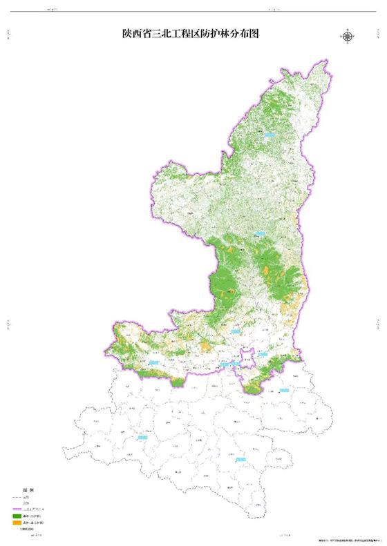 “三北工程”是“防護林”工程,也是中國生態(tài)文明建設(shè)的重要標(biāo)志性工程。1978年11月25日,國務(wù)院批準(zhǔn)實施三北防護林體系建設(shè)工程(簡稱“三北工程”),規(guī)劃期由1978年到2050年,規(guī)劃區(qū)總面積65億畝。“三北工程”是人類最具雄心的生態(tài)工程。陜西是“三北工程”之省,秦嶺以北的黃河流域,包括秦嶺北麓、關(guān)中平原、渭北旱塬、丘陵溝壑、毛烏素沙地,皆是“三北工程”區(qū)。陜西“三北工程”區(qū)總面積1.83億畝,占全省土地面積的59.29%、占全國“三北工程”區(qū)面積的2.8%。